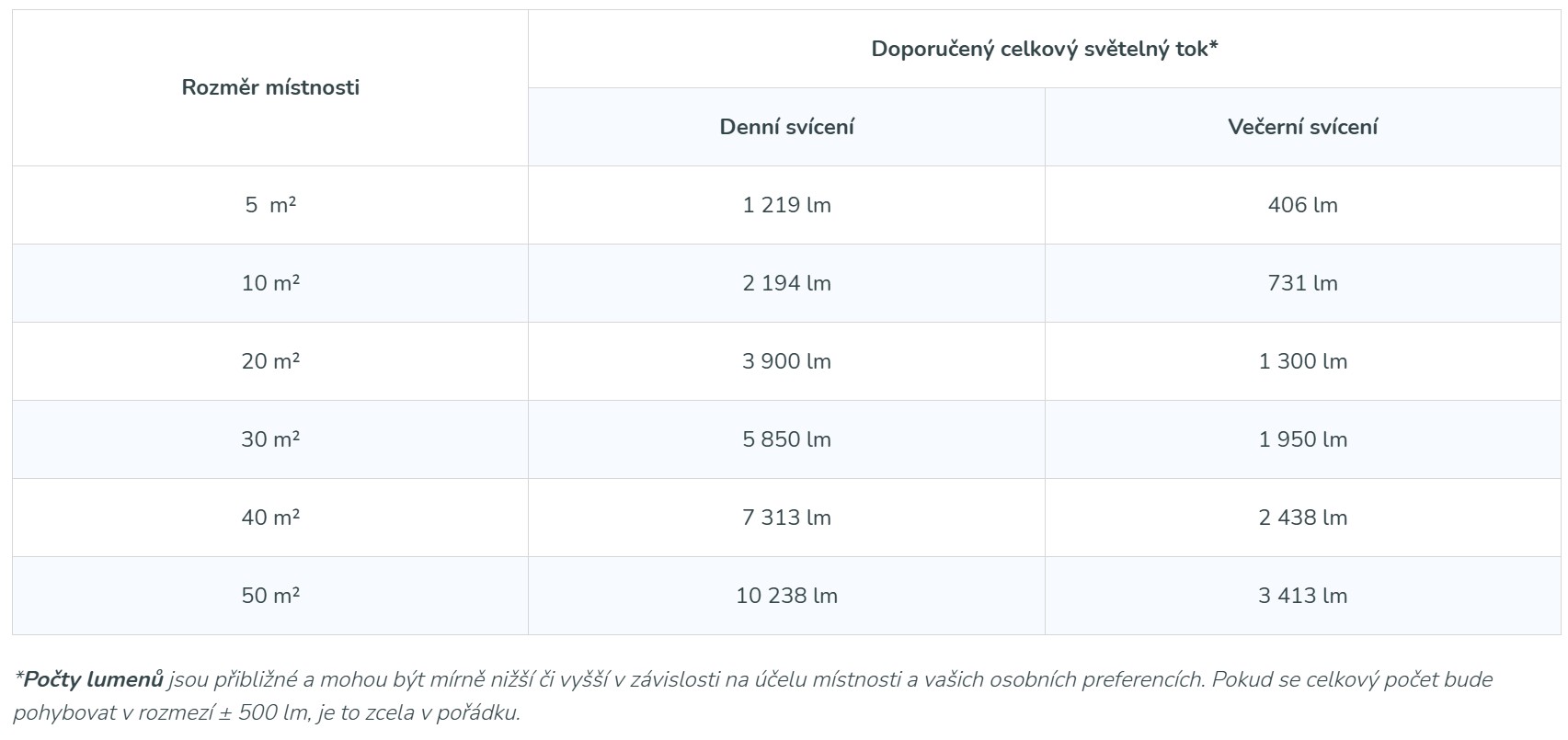 Pro lepší orientaci jsme pro vás připravili přehlednou tabulku s doporučeným množstvím světla podle velikosti prostoru. Hodnoty v tabulce odpovídají místnostem jako jsou chodby, schodiště, šatny a další, kde během dne netrávíte mnoho času. Stačí sečíst lumeny jednotlivých žárovek a zjistíte, zda je osvětlení místnosti dostatečné. Tabulku najdete zde.
