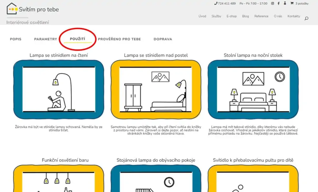 Lampa má mít takové stínidlo, díky kterému vás nebude žárovka oslňovat. Vhodné je jakékoliv stínidlo, které zamezí přímému pohledu na žárovku. Nejčastěji se používá látkové.