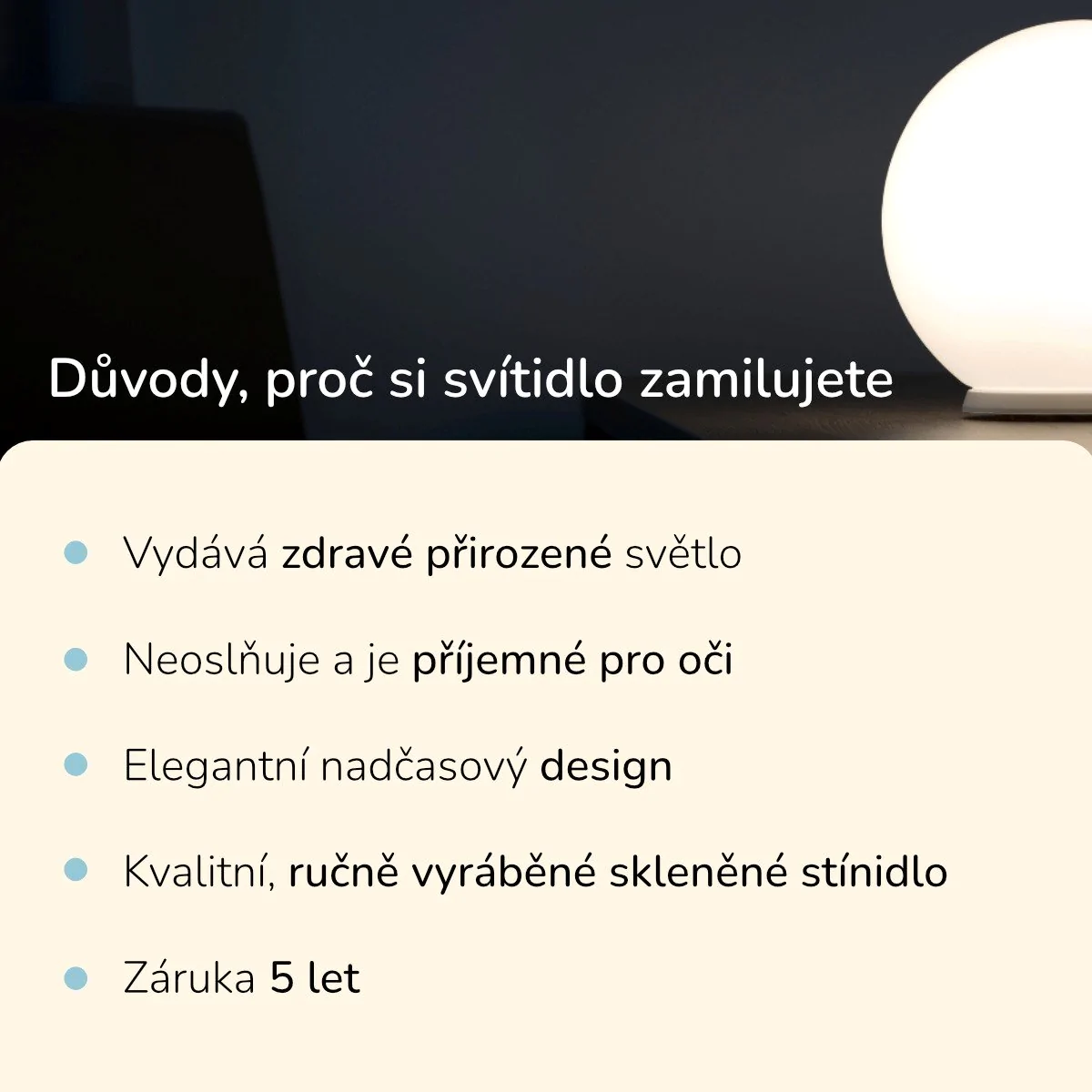 Sháníte stolní lampu do ložnice či pracovny, jejíž světlo bude zároveň příjemné pro oči? Měsíční lampa ORANŽOVKA to přesně splňuje. Skleněné, Číst víceručně vyráběné stínidlo zajistí luxusní vzhled, který vašemu pokoji bude slušet. O zdravé světlo se pak postará žárovka ORANŽOVKA, jež je součástí balení. Dokonale napodobuje přirozené světelné podmínky, přičemž vybrat si můžete mezi denní, večerní či celodenní chytrou.