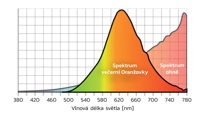 Večerní Oranžovka svítí přirozeným oranžovým světlem bez modré složky, jak můžete vidět na obrázku světelného spektra níže. Modrá složka má totiž na tělo aktivizační účinky a večer je škodlivá, protože brání tvorbě spánkového hormonu melatoninu, jak potvrzují odborníci ze Státního zdravotního ústavu.