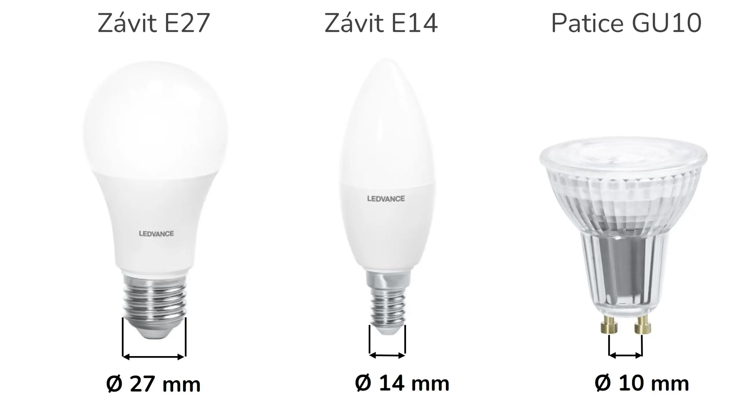 Základním kritériem při výběru každé žárovky je volba správného závitu či patice, abyste ji ve vašem svítidle mohli použít. Večerní žárovky Oranžovky nabízíme ve variantách se závity E27 a E14 a paticí GU10. Číslo v označení znázorňuje průměr závitu v milimetrech nebo vzdálenost mezi dvěma výstupky patice.