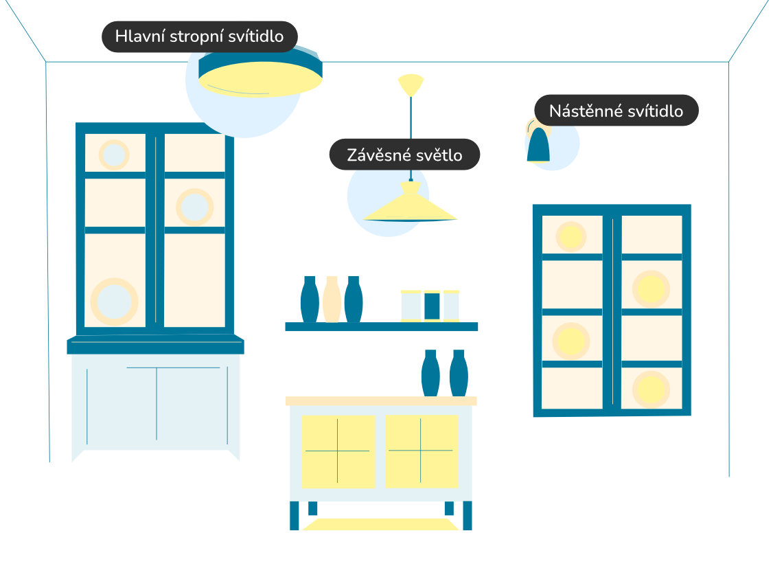 Základem je hlavní stropní světlo, které celou místnost rovnoměrně osvětlí. Zvolit můžete zapuštěné svítidlo, které splývá se stropem a vizuálně nepůsobí nijak rušivě. Ověřte si jen, že je stropní podhled dostatečně hluboký, aby do něj bylo možné svítidlo zapustit.